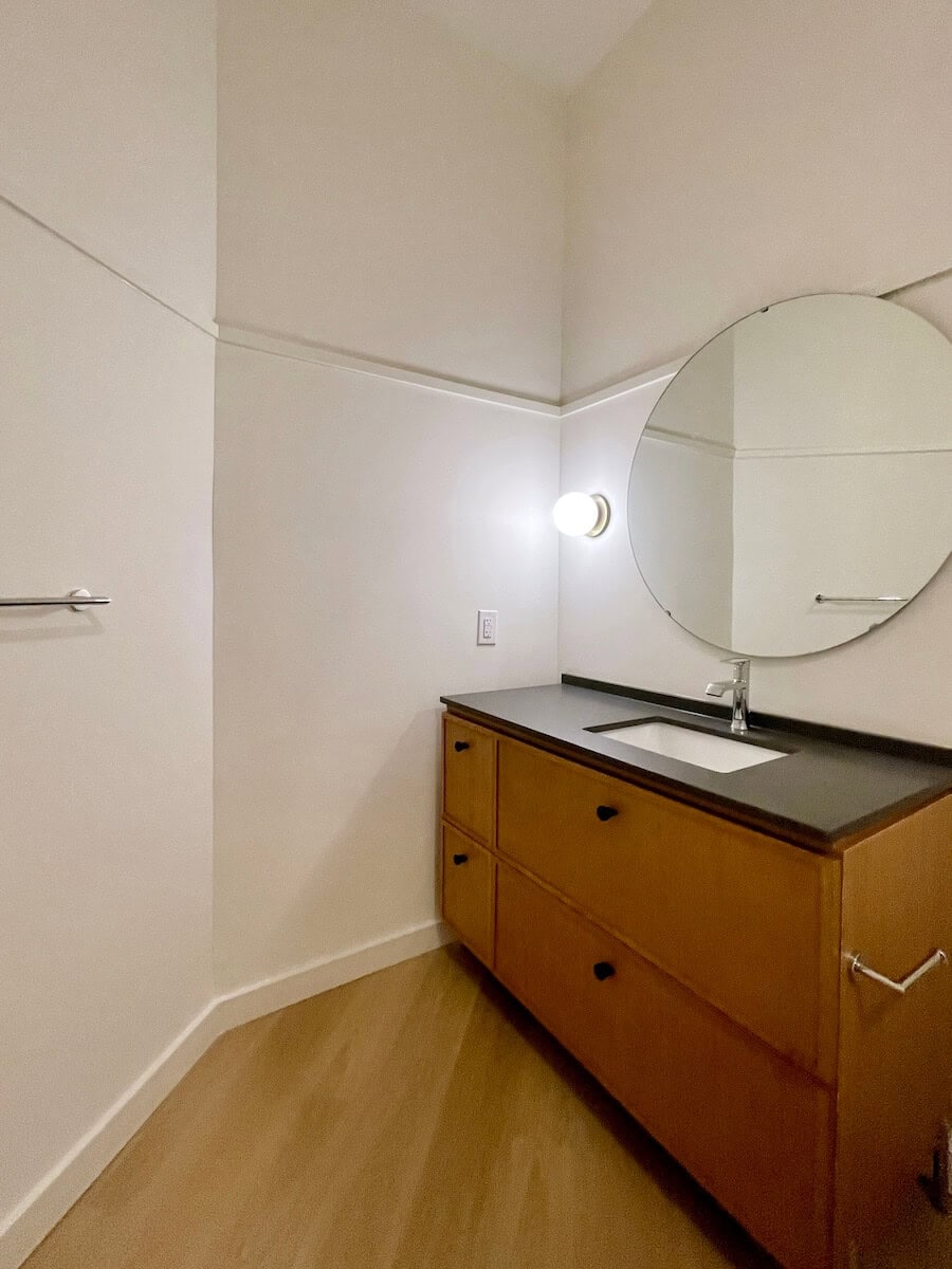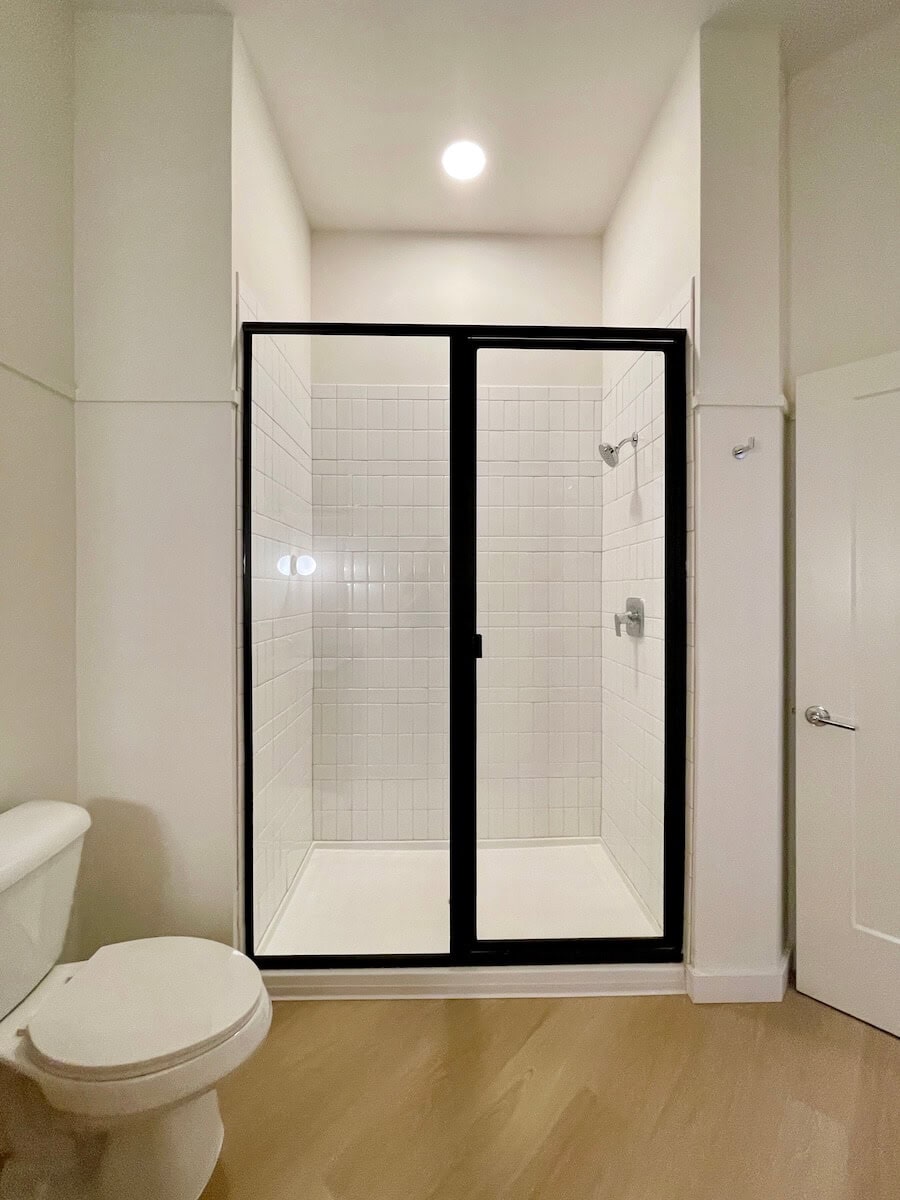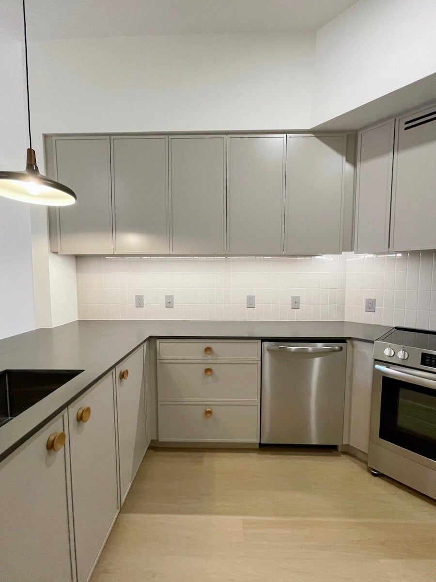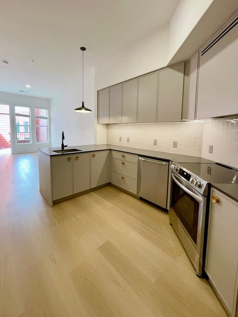 Minimalist apartment in NoDa with great patio! The developers are from Brooklyn and brought their own design flair – you will not be disappointed in any detail. Sleek grey cabinetry with tonal slab cabinets and striking pendent lighting. Bath with walk in shower. Building has full resident amenities including a rooftop patio with views of Uptown.